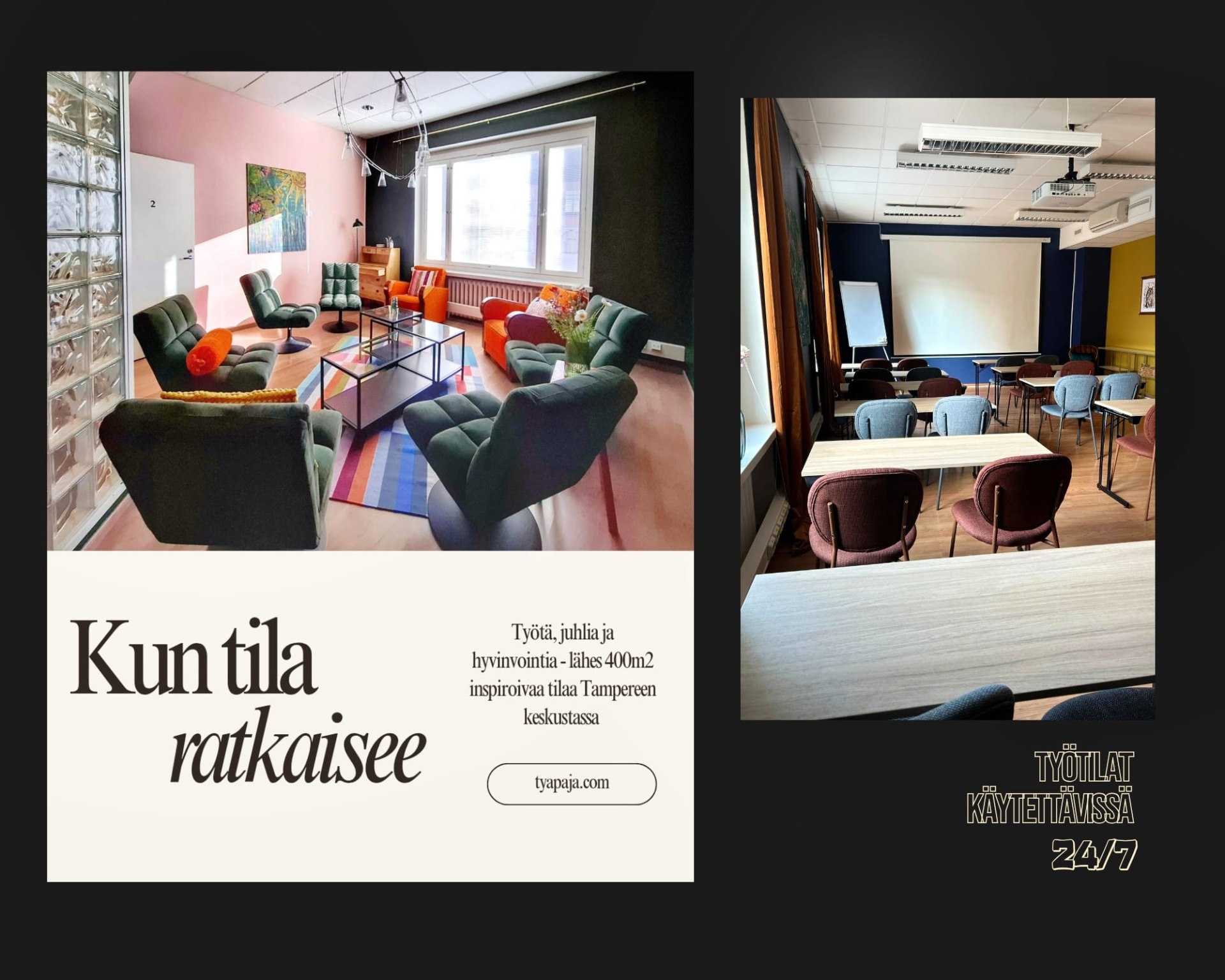 Tyäpaja tarjoaa melkein 400 m2 viihtyisiä ja inspiroivia, muuttovalmiita työhuoneita, coworking-tiloja sekä koulutus- ja kokoustiloja Tampereen keskustassa. Uutuutena myös vuokrattava wellness -huoneet.