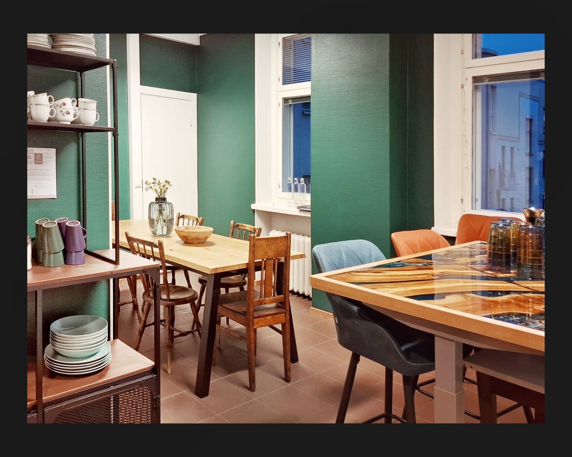 Vakituisten huoneiden asiakkaille ja coworkkajille hintaan kuuluvat aina kahvi ja tee. Lisäksi keittiöltä voit ostaa syötävää sekä juotavaa ja valmistamme tilauksesta myös maukkaat kokousherkut.